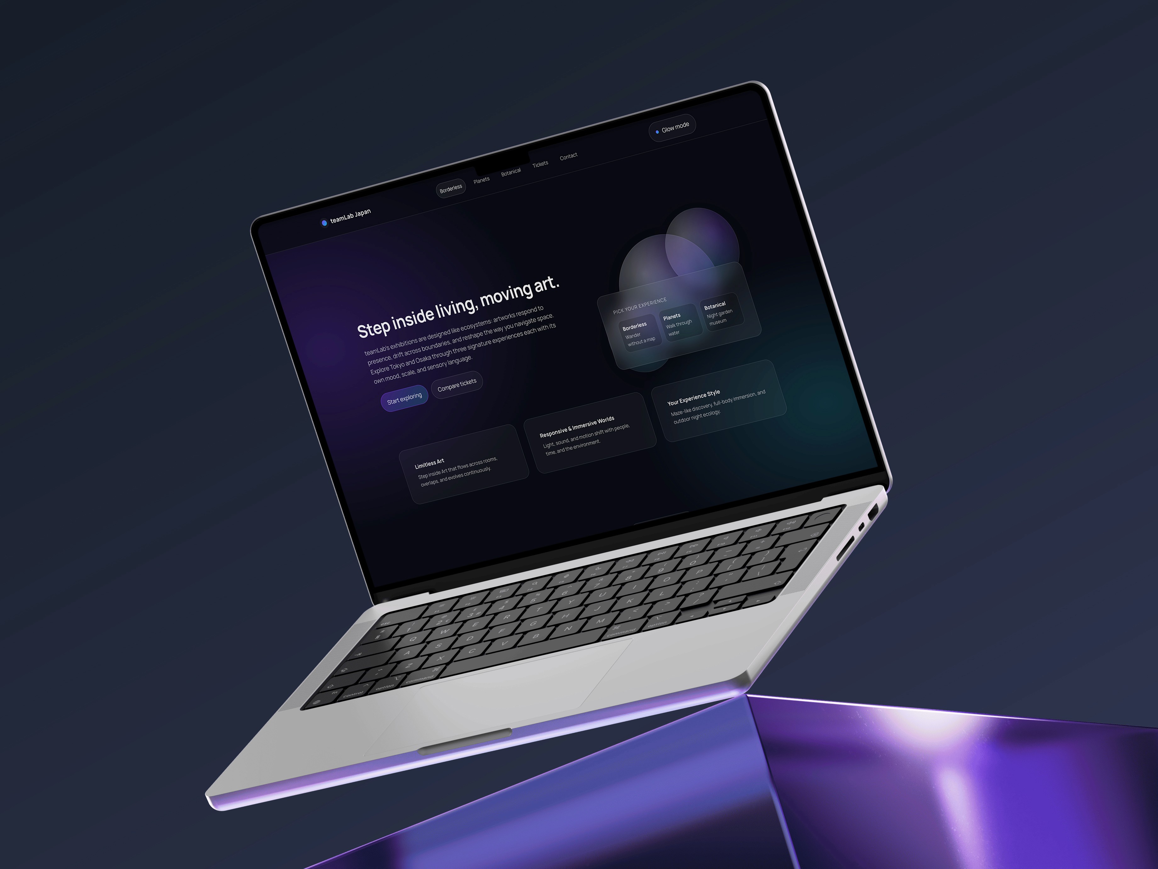 I drew visual inspiration from teamLab’s immersive environments, translating light, motion, and spatial depth into layered gradients, elegant glass-like panels, and smooth interactive motion. The dark interface allows color to function as light, echoing how artworks emerge from darkness in physical exhibitions.
